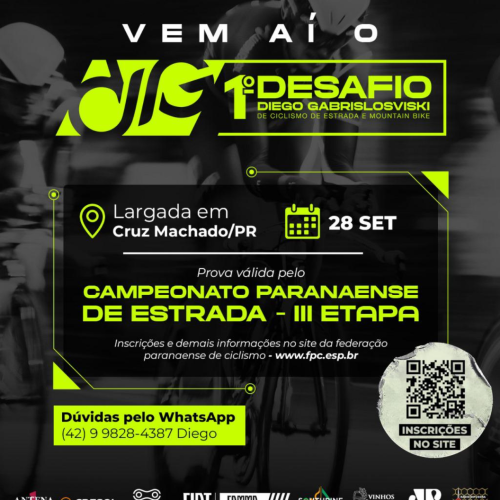 No dia 28 de setembro de 2025, acontece o 1º Desafio Diego Gabrislosviski de Ciclismo de Estrada e Mountain Bike – uma etapa única na região, que será o maior evento esportivo da história do município! 🔥
