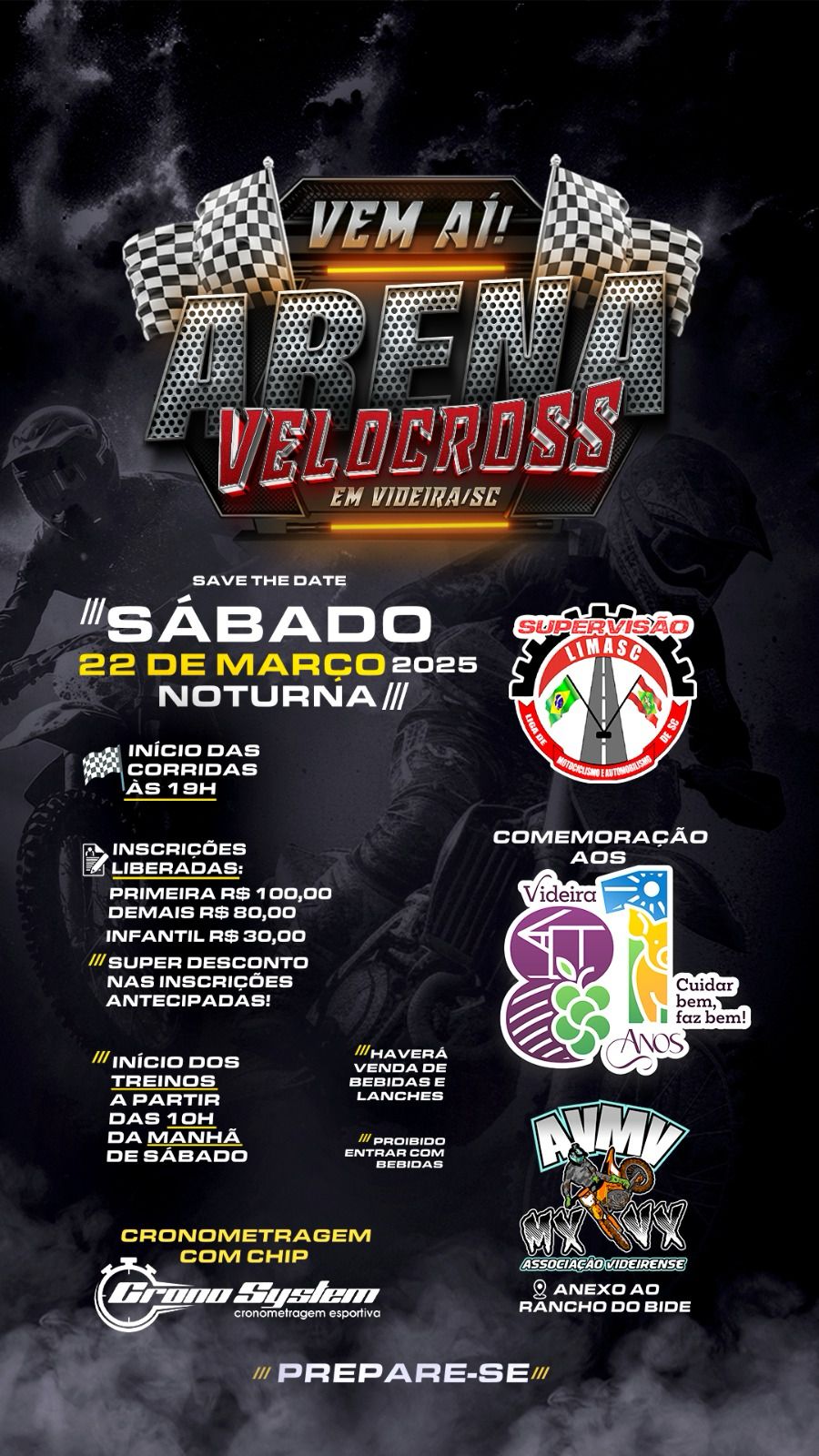 No último final de semana, realizamos a Arena Velocross em Videira, no dia 27 de março, em um evento que reuniu pilotos de várias categorias e proporcionou um verdadeiro show de velocidade e técnica.