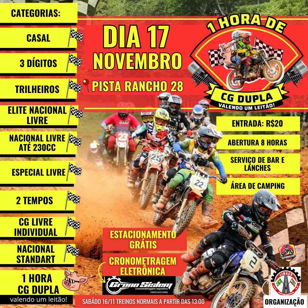 O cronograma do domingo inclui treinos livres das 08h às 09h30 e provas para diversas categorias ao longo do dia, com apresentações de freestyle às 12h e às 14h30. A principal prova, 1 Hora de CG DUPLA, acontece das 15h30 às 16h30, com largada em dupla e possibilidade de revezamento entre os pilotos da equipe.